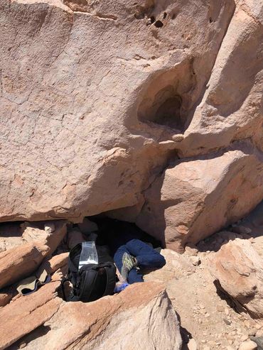 Buried waist deep in an alcove collecting ancient crop samples and animal bones, Atacama Desert