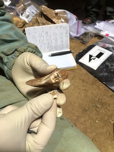 Using a Dremel to sample a ~20,000 year old camel tooth, sitting on the cave floor in Natural Trap Cave, Wyoming